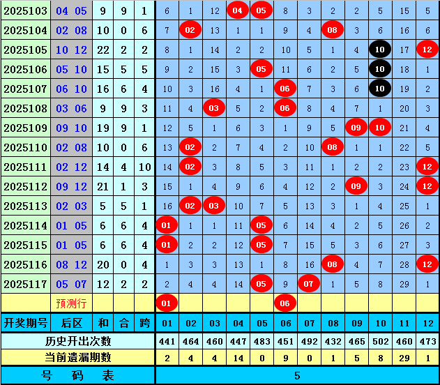 后区分析:在第118期历史同期开奖中,后区奖号奇偶比为21:13,最近5年同期后区奇偶走势为:一奇一偶、一奇一偶、全偶、一奇一偶、全奇,今年同期预计奇偶号码同出,关注两码01、06。