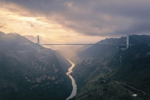 花江峡谷大桥的桥面至水面高度为625米,主桥跨径1420米属于世界第一,全长2890米。