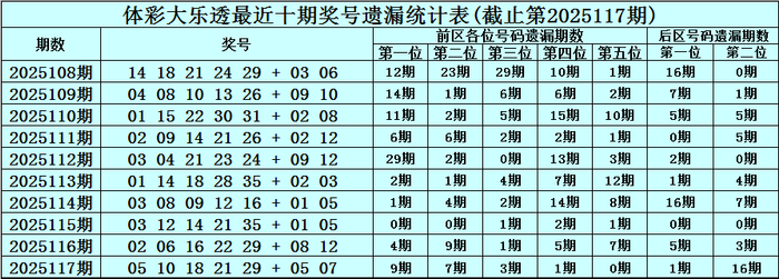 第2025117期奖号:05 10 18 21 29 + 05 07 ,各位号码遗漏期数为:9期、7期、3期、1期、0期 + 1期、16期。